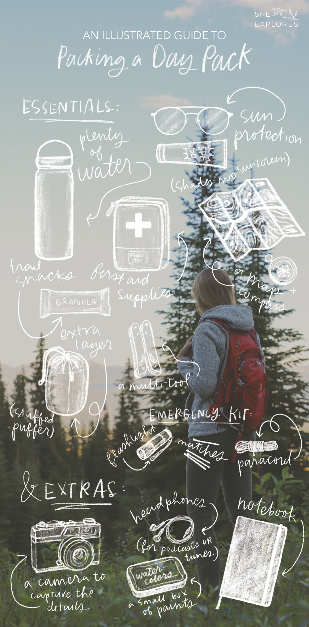 A visualized guide for what to pack in your day pack. All the essentials are sketched over an outdoor photo of day hiking in the mountains.