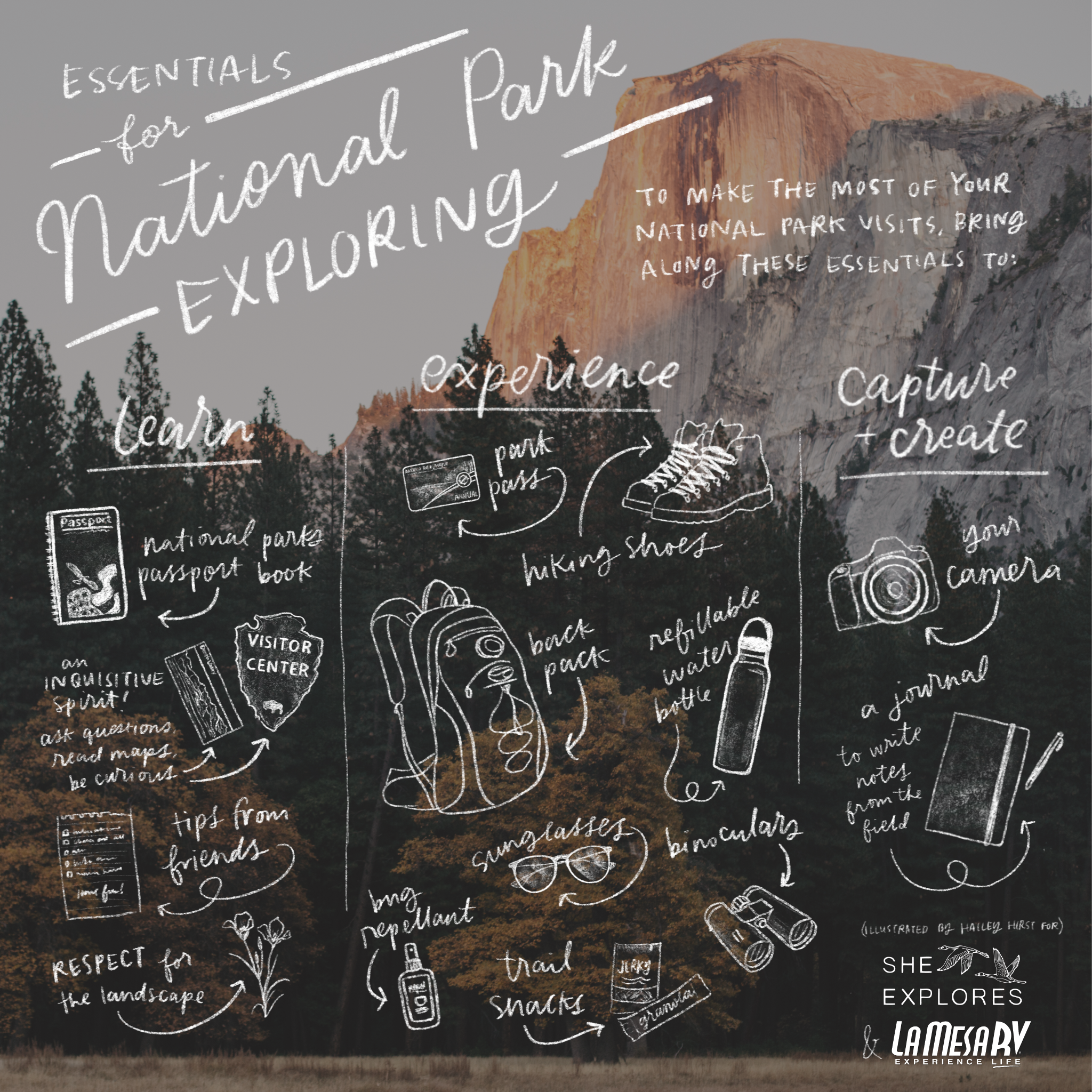 A visualized guide for what to bring along to explore a National Park. All the essentials are sketched over an outdoor photo from Yosemite.