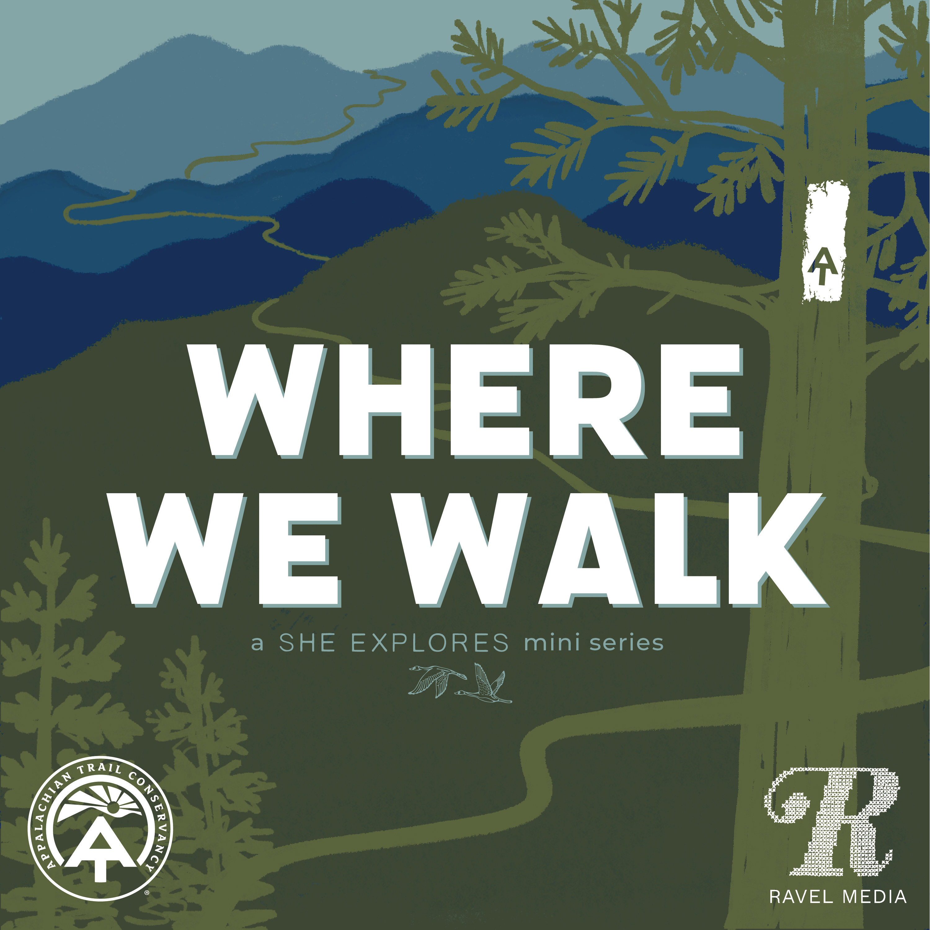 Podcast art created for a She Explores miniseries in partnership with the Appalachian Trail Conservancy, utilizing custom illustration of the blue ridge mountains and AT trail blaze symbol.